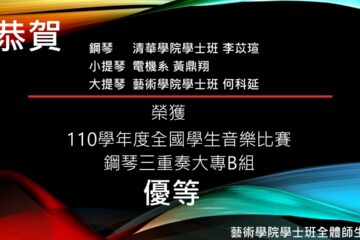 恭賀! 藝術學院學士班 何科延 同學 榮獲 110學年度全國學生音樂比賽鋼琴三重奏大專B組 優等