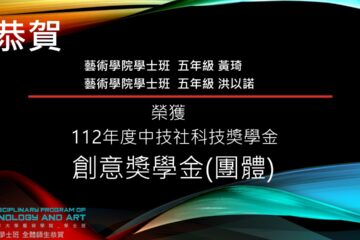 【恭賀】藝術學院學士班 大五 黃琦、洪以諾 榮獲112年度「中技社科技獎學金」-創意獎學金(團體)