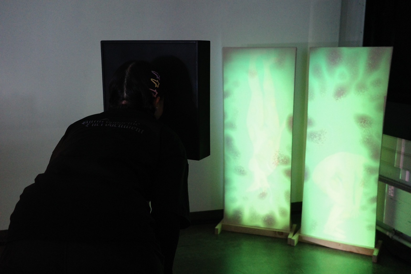 科技藝術研究所黃紀虹的作品《Vibration and Traces》,作品中提及的人工地震指的是由人類活動引起的地震事件,而不是自然發生的地震,此想法建立於展場本身面臨著老舊、隨時可能被拆除的問題,試圖透過作品放大人群的腳步震動,成為對建築本身的破壞。