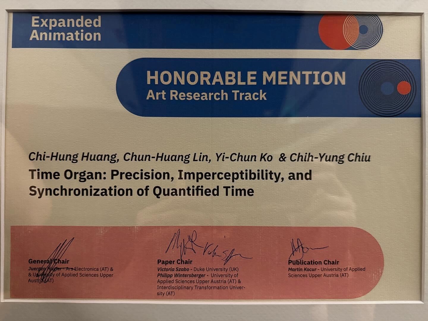 科技藝術研究所黃紀虹、林俊遑、柯宜均助理教授與邱誌勇教授的共同著作—「Time Organ: Precision, Imperceptibility, and Synchronization of Quantified Time」,在同為林茲電子藝術節系列活動的Expanded Animation研討會Art Research Paper單元入選,該文章並獲得Honorable Mention優秀論文獎項為校爭光。