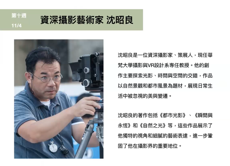 - 演講所屬單位及職稱: 華梵大學攝影與VR設計系教授、資深影像創作者、國家文化藝術基金會董事