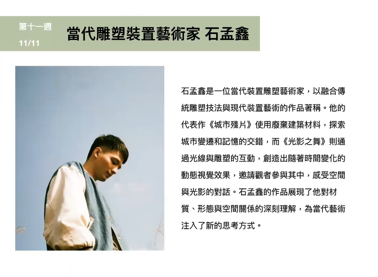 第11週 演講時間: 2024年11月11日 15點30分至17點20分 演講地點:國立清華大學南大校區 N102教室 講者姓名:石孟鑫 演講所屬單位及職稱: 當代裝置雕塑藝術家 講題:石孟鑫創作分享 簡介: 分享自己一路從美術班、藝術相關科系畢業後、與畫廊,美術館、藝術季,合作的經驗分享,以及創作上因不同環境的變化的過程。 Categories: 公告活動演講科技藝術