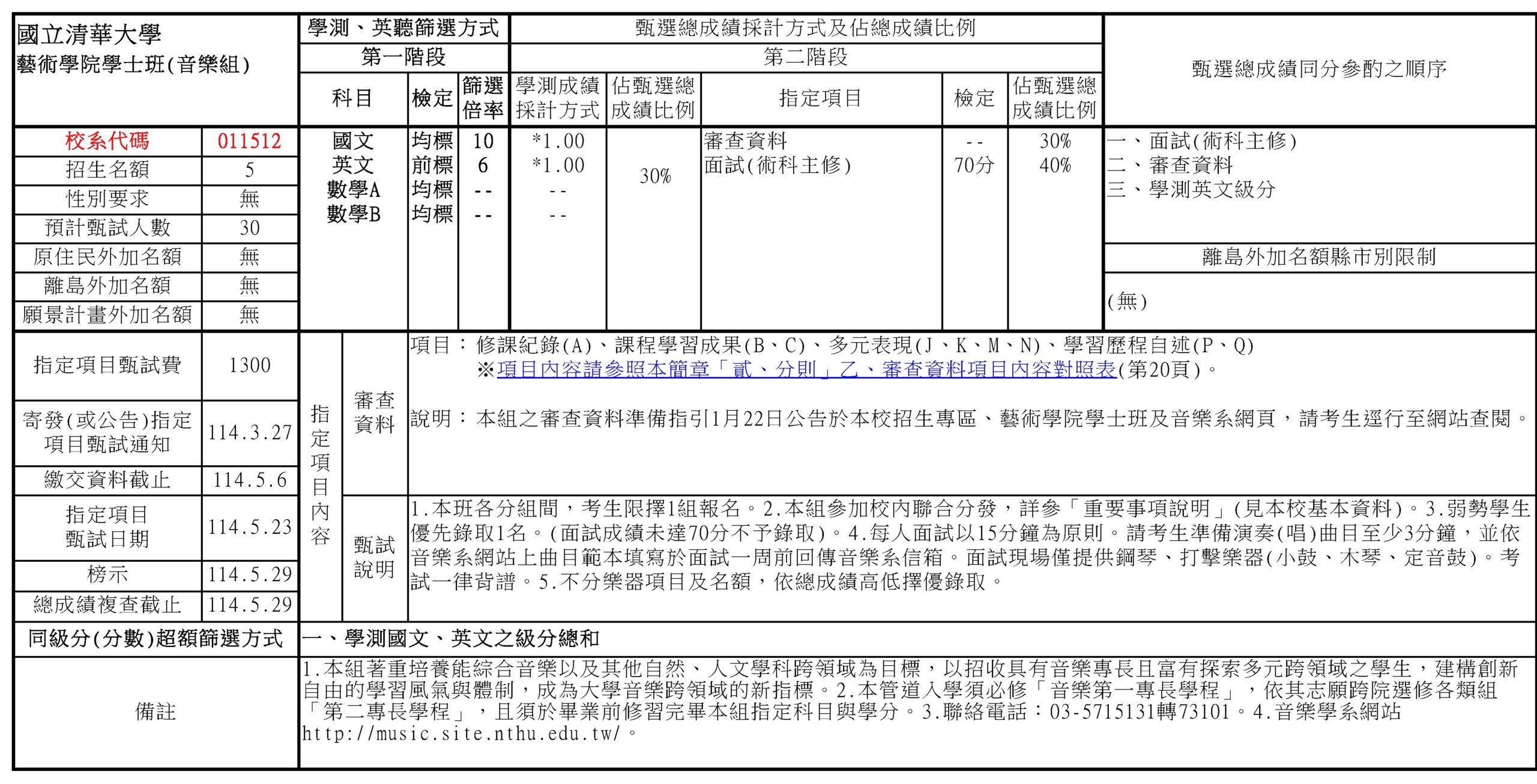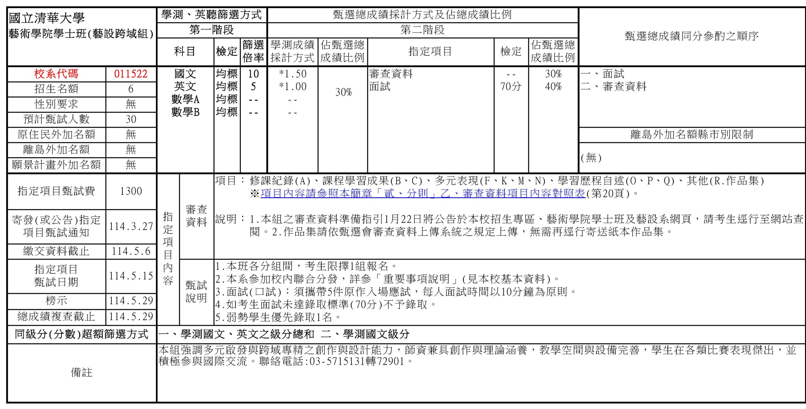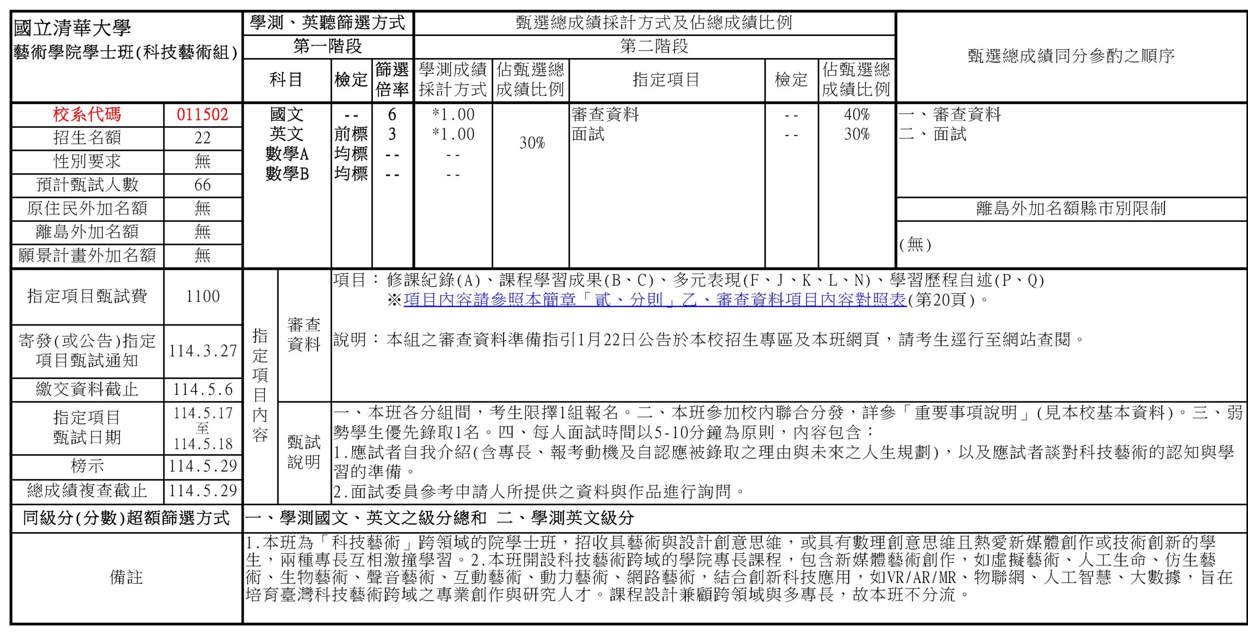 國立清華大學藝術學院「學士班」114學年度,共招生40名 (含申請入學33名<含科藝組22名、藝設組6名、音樂組5名>、考試分發 7名) 國立清華大學藝術學院114學年度「學士班」申請入學 招生簡章 如下: 簡章下載:科藝組、藝設組、音樂組 *科技藝術組 *藝設跨域組 *音樂組 Categories: 招生相關(高中)科技藝術高中生專區