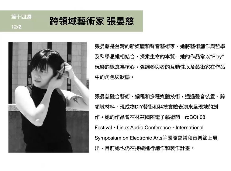 簡介:此次分享會將以新媒體藝術和跨域合作的角度,探討從學校到職場的創作歷程轉變。首先,將回顧在學期間的創作經驗,聚焦於資源、創作思考模式,以及在學期間多樣化的實驗性探索。接著,分享步入社會後所面臨的挑戰,包括資源整合、技術應用,以及適應產業需求的創作轉型。最後,將以歐洲展演經驗為例,探討跨文化合作中的機遇與挑戰,並反思多元文化交流如何豐富創作視野之經歷。