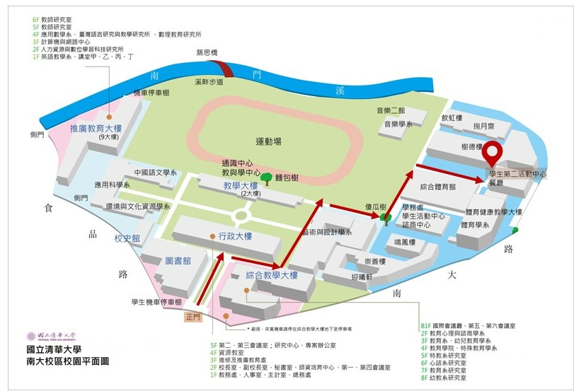 二、報到地點:本校 南大校區 (新竹市南大路521號) 第二活動中心三樓,請至報到處報到。